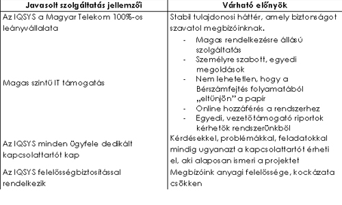 Fontos, hogy kiszervezés esetén az IQSYS megbízónak lehetősége van arra, hogy az alkalmazás igazodjon az Ő igényeihez, és ne Ő igazodjon az alkalmazáshoz. A fejlett információs technológia eredményeképpen magas szintű az adatvédelem és az adatbiztonság, emellett minden adat és információ könnyen, riportok, statisztikák formájában hozzáférhető, amely az on-line felületnek köszönhetően magas szintű kényelmet garantál a megbízóink számára.