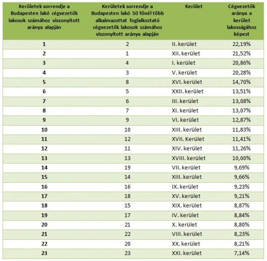 Érdekes azonban megnézni azt, hogy a nagyobb cégek (50 fő felett foglalkoztatók) vezetői általában hol laknak. Nem meglepő, hogy a budai kerületek erősen felülreprezentáltak körükben. A nagyobb vállalkozások vezetőinek körében a legnépszerűbb a XII. kerület, a II., V. , I. és a XXII. kerület. Azaz az országos átlaghoz képest a nagyobb cégek vezetői a XII. kerületet előnyben részesítik a II. kerülethez képest, illetve a XXII. kerület is bekerült körükben a legkedveltebb lakóhelyek közé.
