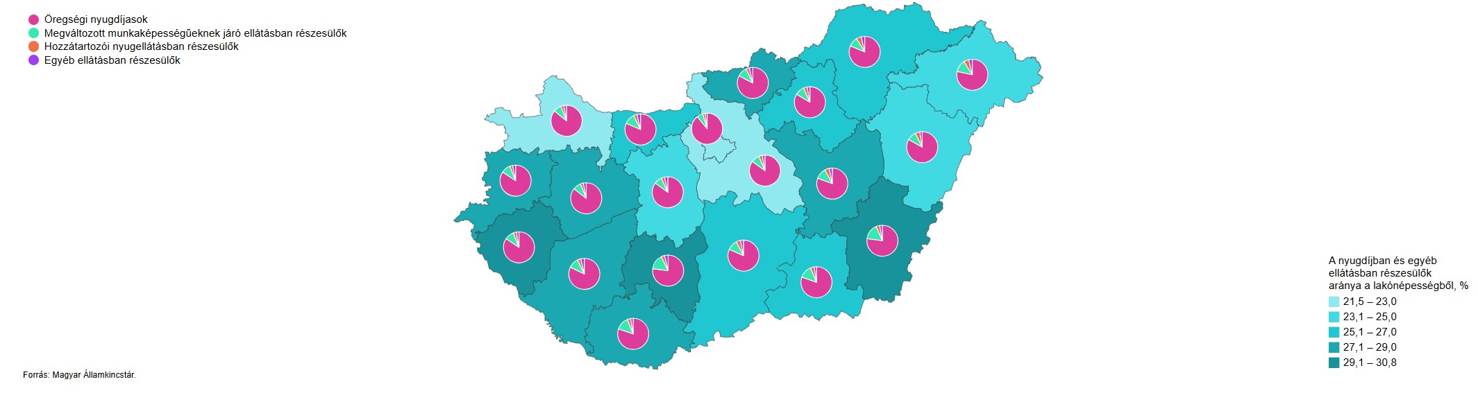 Az öregségi nyugdíjasok aránya az ellátottak közül Budapesten volt a legmagasabb (89%), Győr-Moson-Sopron, Veszprém és Fejér vármegyében érte még el a 85%-ot, ugyanakkor Tolna vármegyében volt a legalacsonyabb (77%). Megváltozott munkaképességűeknek járó ellátásokat a legnagyobb hányadban Békés és Tolna vármegyében folyósítottak (16-16%), szemben a főváros 6,2%-os értékével. A főellátásként hozzátartozói nyugellátásban részesülők mutatója Szabolcs-Szatmár-Bereg vármegyében volt a legmagasabb 5,5%-kal.