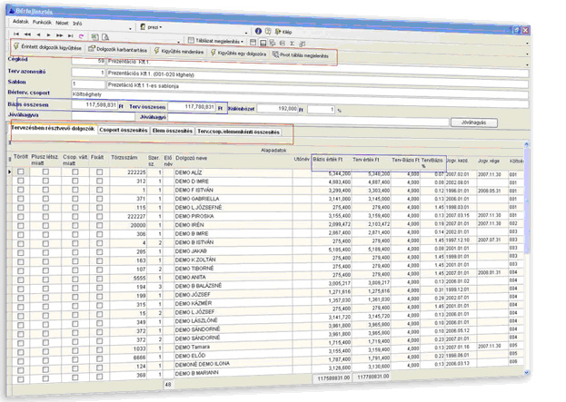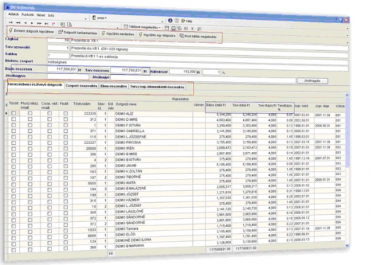 A PIRAMIS™ Bérköltség-tervezésből kinyerhető kimutatáson látható - a vállalat/dolgozó megbontásban a bázis bérköltségek, és a béremelést követően tervezett bérköltség összesen. A kép felső soraiban a vállalat egészére összesített adatokat láthatjuk.