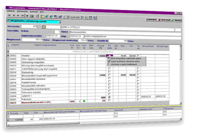 Képernyőkép: PIRAMIS™ bérszámfejtés - Azonnali információ az összesített adatokról (bérszámfejtési jogcímekről) a bérszámfejtés közben: jobb egérgombbal kattintva az összesített adaton a felhasználó megnézheti: