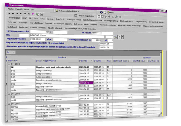 Képernyőkép: A tb-s távollétek kezelése képernyőn egy kattintással elérhető az összes olyan karbantartási lehetőség, mellyel rögzíthető, számfejthető, kezelhető a dolgozó tb-s távolléte.