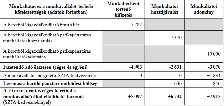 A táblázatban nyomon követhető, hogy 2015-ben a 10 ezer forintos bruttó bérkeret munkabérként 5 ezer forintot, a patikakártya munkáltatói hozzájárulásként való feltöltése esetén 6,7 ezer forintot, adományként való felöltése pedig 7,9 ezer forintot ér!