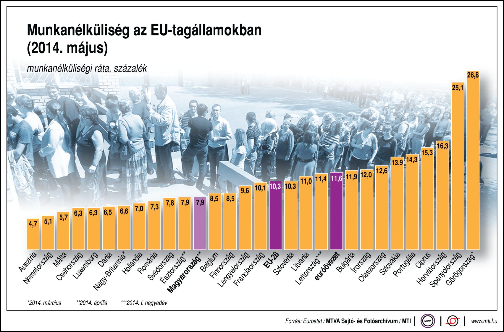 A legalacsonyabb, 4,7 százalék Ausztriában volt a munkanélküliség, míg a legmagasabb rátát Görögországból (26,8 százalék) és Spanyolországból (25,1 százalék) jelentették.