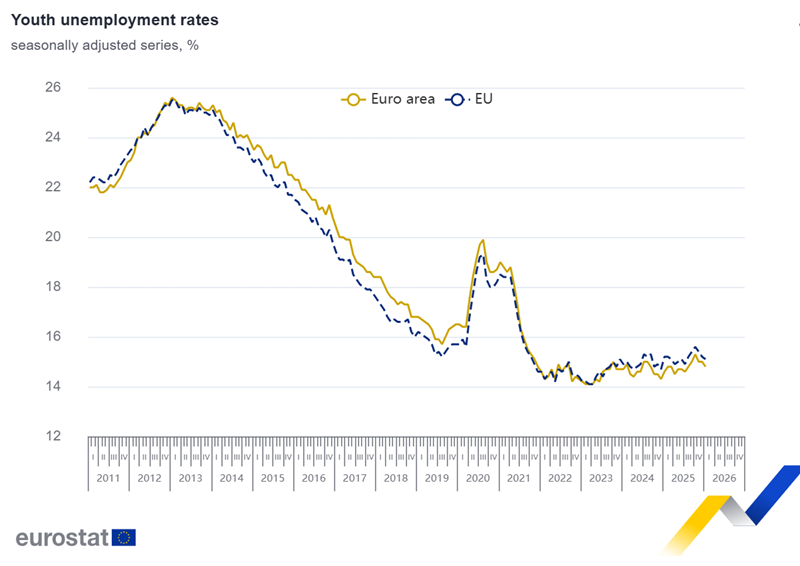 A fiatalok munkaerőpiaci helyzete ugyanakkor továbbra is jóval kedvezőtlenebb. 2026 januárjában az EU-ban 2,922 millió, 25 év alatti fiatal volt munkanélküli, közülük 2,352 millió az euróövezetben. A fiatalok munkanélküliségi aránya az EU-ban 15,1 százalék volt, ami enyhe csökkenést jelent a decemberi 15,2 százalékhoz képest. Az euróövezetben 14,8 százalékra mérséklődött ez a mutató a korábbi 15 százalékról.