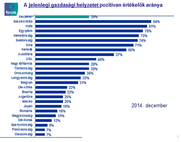 2012-ben a magyarok 5, egy évvel később 11 százaléka értékelte kedvezően a nemzetgazdaság állapotát, míg tavaly átlagosan 18 százalék. 2014 végén a 25 országból álló ranglista 21. helyére kerültünk, a miénknél kedvezőtlenebb a gazdasági helyzetértékelése a dél-koreaiaknak, a spanyoloknak, a franciáknak és az olaszoknak