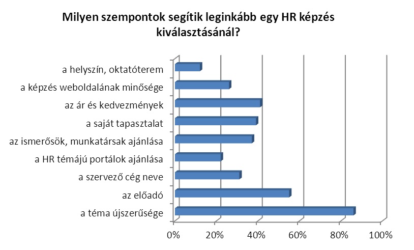 Arra a kérdésre, hogy mi a legmeghatározóbb információ egy képzés kiválasztásakor, a választ adók 86százaléka a képzés témájának újszerűségét, 55 százaléka az előadó személyét jelölte meg. Kevésbé esett latba akár a helyszín vagy az oktatóterem (12 százalék), de még a weboldal minősége (csupán 26 százalék), informativitása és esetleges ismerősök, munkatársak ajánlása is csak mérsékelten meghatározó (37százalék). Meghatározónak találták viszont az árat, kedvezményeket (41 százalék) és a saját korábbi tapasztalatokat (39 százalék).