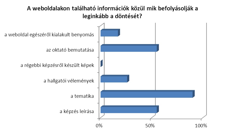 A fentiekkel összecsengett a válaszolók azon véleménye, miszerint a weboldalakon található információk közül a tematika (90 százalék), illetve a képzés leírása (55 százalék), valamint az oktató bemutatása (55 százalék) jóval hangsúlyosabb, mint akár más hallgatók véleménye (26 százalék). Ez utóbbi akár azt is tükrözheti, hogy a képzésen részt venni szándékozó szakember által nem ismert résztvevők visszajelzése nem teljes körű, kiválogatottsága miatt nem feltétlenül megbízhatóan reprezentálhatja számára a tényleges minőséget.