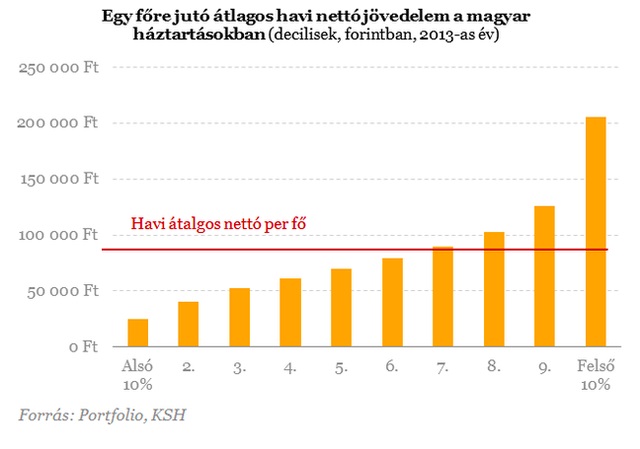 Ha egy háztartásban 206 ezer nettónál több jut egy főre havonta, az már a legfelső 10 százalékba tartozik. A KSH adatai alapján készült a Portfolio grafikonja.