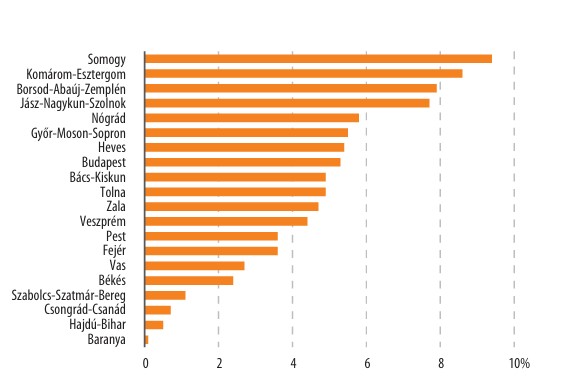 A betöltetlen orvosi állások aránya vármegyénként - grafikon