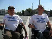 Az egészségügyi bizottság politikusai talán nem találtak tiszta inget vagy elromlott a légkondi az autójukban? - találgattak a demonstrálók, míg közben a szél kicsavarta a fejük fölött ingázó sörsátor lábait. Átmeneti megoldásként minden résztvevőre jutott egy láb, amit megfoghatott. Ebben az összefogásban nem volt hiba. Amíg páran a sátor földön tartásán dolgoztak, Szűcs Sándor Győző elmondta, három napja kólán él, így tiltakozik a rokkantnyugdíjasok visszaminősítése ellen. A szintén éhségsztrájkoló Lencsés Mária szerint a rokkantakat halálra ítélte a kormány. Autóbalesetben elveszítette a férjét, gyerekeit egyedül neveli. Győző és Mária kerekesszékben ülnek. Mária kikéri magának, hogy csaló lenne, mégis meg kell jelennie a felülvizsgálaton. 50 százalékos rokkant, és ha csak egy százalék-kal visszaminősítik, elveszíti az özvegyi nyugdíját, a nyílt munkaerőpiacon pedig semmi esélye az elhelyezkedésre.