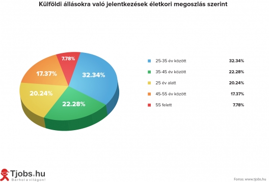 A 35-45 közötti munkavállalók több mint fele (53,23 százalék) németországi munkákra jelentkezett. 45-55 év közöttiek 45,52 százalékban pályáztak és 55 év felett (29,23 százalék) csökkent ugyan a pályázatok aránya, viszont ugyancsak a németországi munkákra történt a legtöbb jelentkezés.