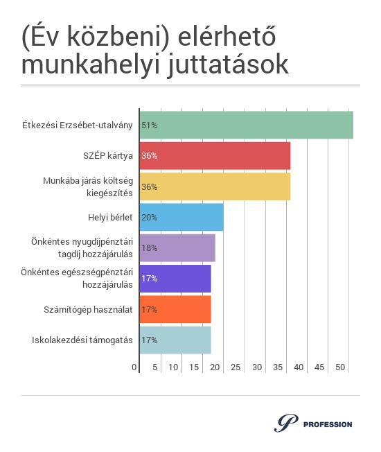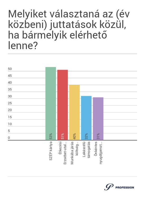 Az év közben elérhető munkahelyi juttatások közül a válaszadók több mint fele (51 százalék) kap étkezési Erzsébet-utalványt, míg több mint egy harmaduk (36 százalék) SZÉP kártyát kap munkaadójától. A munkába járást érintő költség kiegészítésben is ugyanennyien részesülnek, míg minden ötödik válaszadó helyi bérletet, illetve önkéntes nyugdíjpénztári tagdíj hozzájárulást kap rendszeresen. Amennyiben lehetőségük lenne bármilyen elérhető juttatási típust választani, legtöbben (53 százalék) a SZÉP kártyát és az Erzsébet-utalványt (51 százalék) választanák, de népszerű a munkába járásra vonatkozó költség-kiegészítés (40 százalék) is.