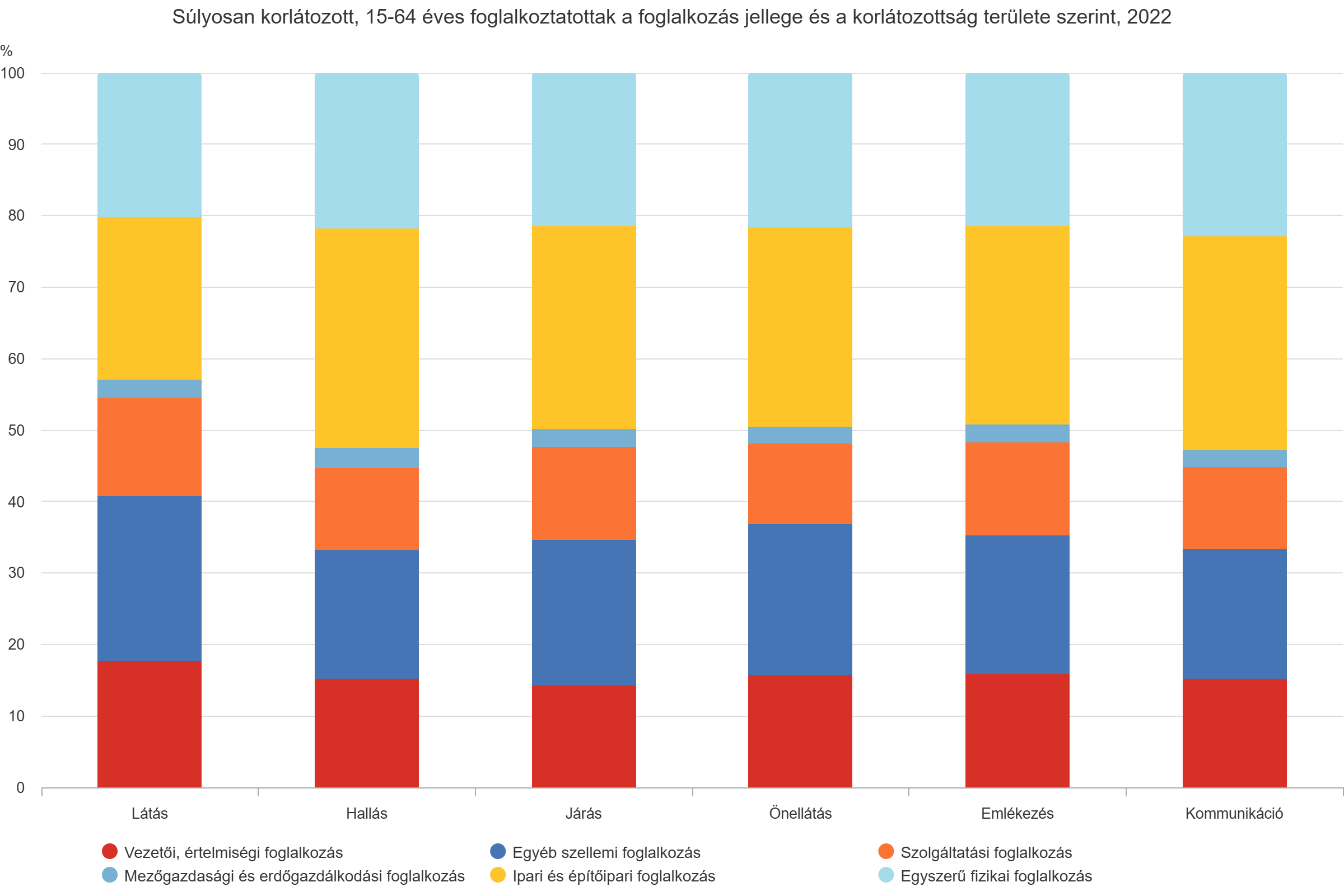 A súlyosan korlátozott foglalkoztatottak között a legnagyobb arányban a látásban korlátozottak végeznek vezető, értelmiségi vagy egyéb szellemi foglalkozást (41%); az egyszerű fizikai, ipari és építőipari munkát végzők aránya pedig a nyelvi kommunikációban és hallásban korlátozottak között a legmagasabb (53, illetve 52%) - derül ki a KSH adataiból.