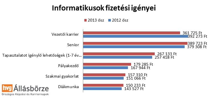 Az informatikai vezetőknél ugyanakkor csökkenő tendenciát figyelhettünk meg: amíg 2012 őszén nettó 392 ezer forint volt a fizetési elvárásuk, egy évvel később 30 ezer forinttal kisebb összeget jelöltek meg átlagosan (362 ezer forint).