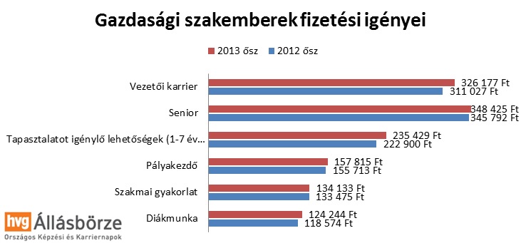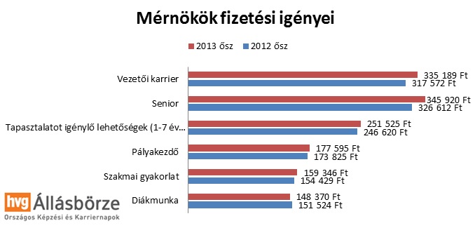 A fizetési igények éves alakulását tekintve minimális növekedést láthatunk az elmúlt években. „2012-ben átlagosan 217 ezer forint volt a felsőfokú végzettségűek által elvárt nettó bér, 2013 őszén ez az összeg 221 ezer forintra nőtt, amely 2 százaléknál kisebb növekedést jelent. Az átlagnál nagyobb mértékben növekedett a tapasztalt mérnökök (5,9 százalék), és a műszaki területen vezető beosztást betöltők (5,5 százalék) fizetési igénye” – mondta el a felmérés kapcsán Toldi Gábor, a HVG HR Center igazgatója.