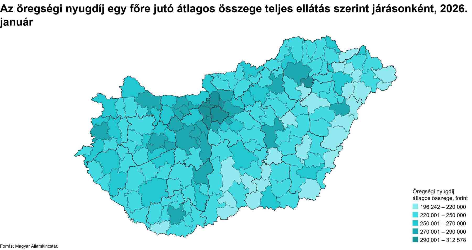 Ez az országos átlagot 50 ezer, a legalacsonyabb vármegyei értéket, Bács-Kiskun vármegye átlagát 79 ezer forinttal haladta meg. Az országos középértéknél magasabb összegű juttatást folyósítottak még Fejér, Pest, Komárom-Esztergom, Veszprém és Győr-Moson-Sopron vármegyében, ugyanakkor Bács-Kiskun, Szabolcs-Szatmár-Bereg és Békés vármegyékben a legalacsonyabbat (234 ezer forint alatt). Járási szinten a Budakeszi járásban az öregségi nyugdíj átlagos összege megelőzte a fővárosét. Ezen kívül négy Pest vármegyei, valamint a Tiszaújvárosi járásban érte el a 290 ezer forintot az átlagos ellátás. Ezzel szemben a dél-alföldi Mórahalmi, Kisteleki és Kiskőrösi, valamint az észak-alföldi Csengeri járásokban az öregségi nyugdíjak átlaga 200 ezer forint alatt maradt. Budapest kerületei közül a XII. kerületben volt a legmagasabb (358 037 forint), a XX. kerületben pedig a legalacsonyabb (282 489 forint) az átlagos öregségi nyugdíj.