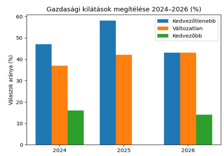Az ország gazdasági kilátásainak megítélése az elmúlt három évben jelentősen változott. Míg 2024-ben a vállalkozások 47%-a, 2025-ben már 58%-a, addig 2026-ban 43%-a számít arra, hogy a következő egy év gazdasági szempontból kedvezőtlenebb lesz az előzőnél.