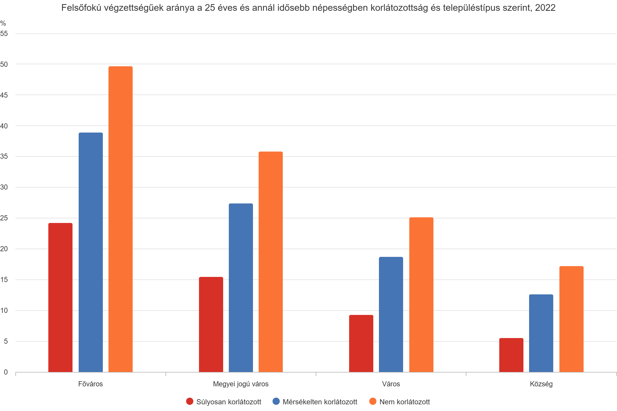 súlyos korlátozottaknál a falvakhoz képest négyszeres, a mérsékelt korlátozottaknál háromszoros a diplomások aránya Budapesten. Általában az is elmondható, hogy Közép-Magyarországon kívül Közép- és Nyugat-Dunántúl vármegyéiben magasabb a felsőfokú végzettségűek aránya a korlátozottak körében, mint az ország egyéb területein.