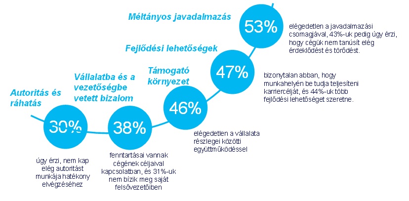 Az is figyelemre méltó adat, hogy globálisan a munkavállalók 53 százaléka elégedetlen a javadalmazásával, 47 százaléka érzi úgy, hogy jelenlegi vállalatánál nem tudja beteljesíteni karriercéljait, és 31 százalékuk nem bízik meg saját felsővezetőiben.