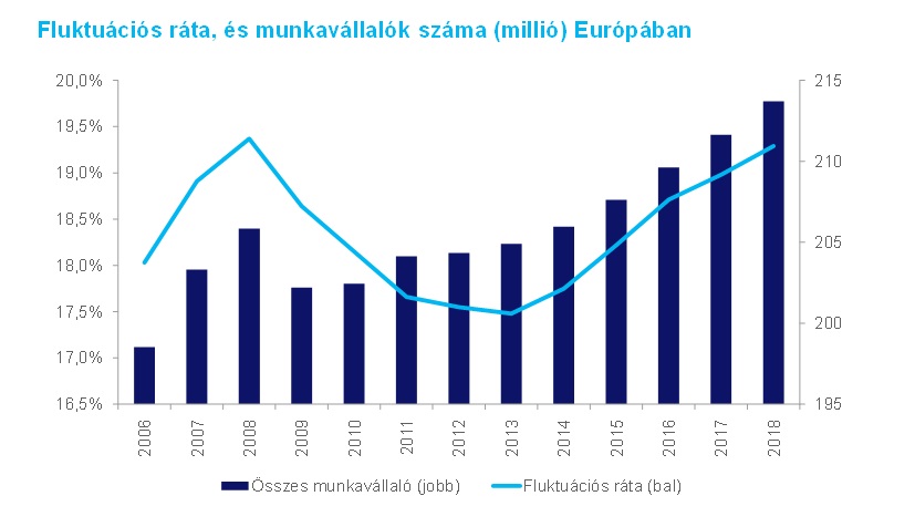 Európában a munkavállalók száma jövőre éri el a 2008-as szintet, azonban a fluktuáció csak 2018-ra ér el oda, ahol a válság előtt volt. Az alábbi grafikon a munkavállalók számának és a fluktuációnak az alakulását mutatja.