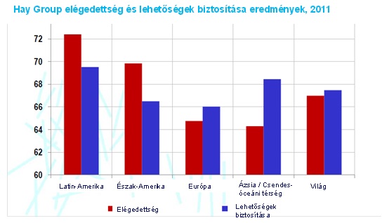 Mindezzel kapcsolatban érdekes megfigyelni, hogy amint az alábbi ábra mutatja, Európában nagyon alacsony a munkavállalók elégedettsége és a számukra biztosított lehetőségek értékelése.