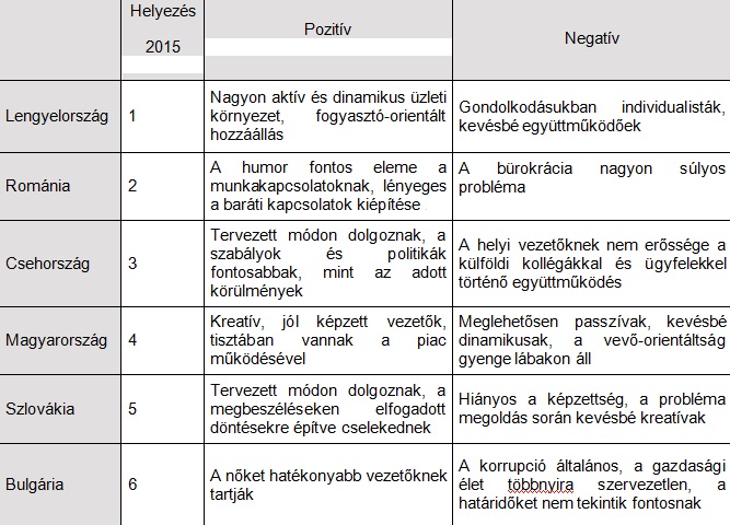 2009-hez képest a válaszadók elégedettsége összességében csökkent. A hat ország rangsorában Románia lényegesen előrébb került, Szlovákia pedig hátrébb sorolódott, míg a felmérés nyertesének a legmagasabb átlaggal Lengyelország számít. A külföldi menedzserek szerint Bulgáriát a korrupció, Csehországot a külföldi partnerekkel megjelenő nézetkülönbségek, Magyarországot pedig a fogyasztó-orientáltság hiánya veti vissza. Az egyes országok az alábbi táblázatban kiemelt egyedi erősségekkel rendelkeznek: