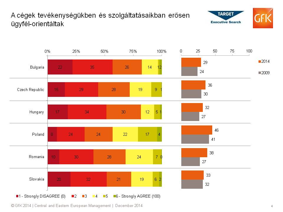 A TARGET Executive Search megbízásából a GfK, valamint a CEU Business School által, mintegy ezer vállalati vezető megkérdezésével végzett kutatás, amelynek megállapításait portálunkhoz is eljuttatták, alapján a vezetők munkához való etikus és elkötelezett hozzáállását, a női munkavállalók attitűdjét, valamint az erős személyes kommunikációs készségeket tekintik az itt működő cégek erősségének. Ugyanakkor a külföldi menedzserek bürokrácia csökkentésében, a korrupció felszámolásában, az ügyfél-orientáltság fokozásában és a nagyobb vezetői felelősségvállalás terén érzik a fejlődés szükségességét. sok tekintetben folytatása a TARGET 2009-es hasonló felmérésének, így az eredmények összehasonlításával fontos változások, trendek megállapítására nyílik lehetőség.