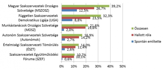 A megkérdezettek 39,2 százaléka spontán említette vagy legalább már hallott az MSZOSZ-ről, 32,3 százalék pedig a LIGA szakszervezetekről. A LIGA-t és az MSZOSZ-t ismertségben bőven lemaradva követi a Munkástanácsok (21,6 százalék), az Autonóm Szakszervezetek Szövetsége (16,9 százalék), az Értelmiségi Szakszervezeti Tömörülés (14 százalék) és a Szakszervezetek Együttműködési Fóruma (10,7 százalék).
