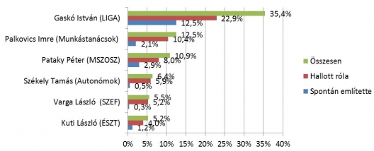 A szakszervezeti konföderációs vezetők ismertsége még ennél is élesebb képet mutat, hiszen azok, akik spontán felsoroltak egy vagy több vezetőt, első helyen túlnyomó többségben Gaskó Istvánt (73 százalék), illetve ennél jóval alacsonyabb arányban Pataky Pétert (12 százalék) nevezték meg.