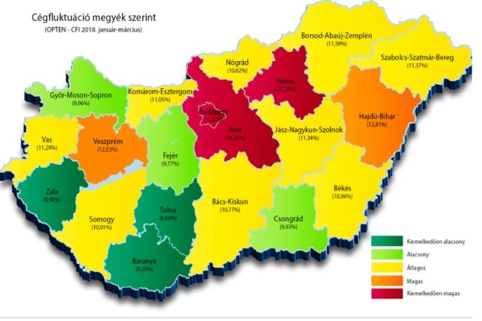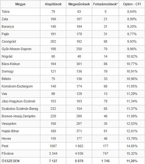 Az Opten - Cégfluktuációs Index (az adott időszak alatt törölt és alapított cégek számát viszonyítja az időszak elején rendben működőkéhez) első negyedévre vonatkozó értéke átlagosan 10-11 százalék körül mozgott. Megyei szinten nézve a vizsgált időszak alatt az Opten - CFI Tolna, Zala és Baranya megyékben érte el a legalacsonyabb értékeket, míg a legmagasabb fluktuációt Budapest, Pest és Heves megye produkálta.