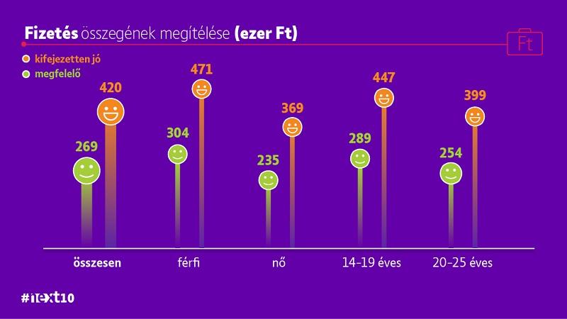 A fiatalok átlagosan 269 ezer forintot tartanak olyan fizetésnek, amiért tervezett képzettségükkel már elmennének dolgozni, és 420 ezer forintot tartanak kifejezetten jó fizetésnek. Erős a nemek közti különbség: a férfiak 100.000 forinttal magasabb bért tartanak kifejezetten jó fizetésnek, mint a nők. A 14-19 éves korosztály is nagyobb összegekre számít, mint a 20-25 évesek, de itt az álomfizetések közti különbség kisebb (49.000 forint), mint a nemek közt.