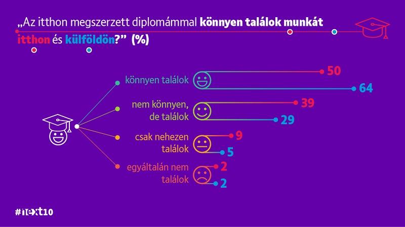 különbség a gimnazista korosztályban a legerősebb: 67 százalékuk úgy gondolja, hogy könnyen talál majd a végzettségének megfelelő munkát külföldön, és csak 52 százalékuk válaszolt igennel arra a kérdésre, hogy könnyen talál-e majd a végzettségének megfelelő munkát itthon.