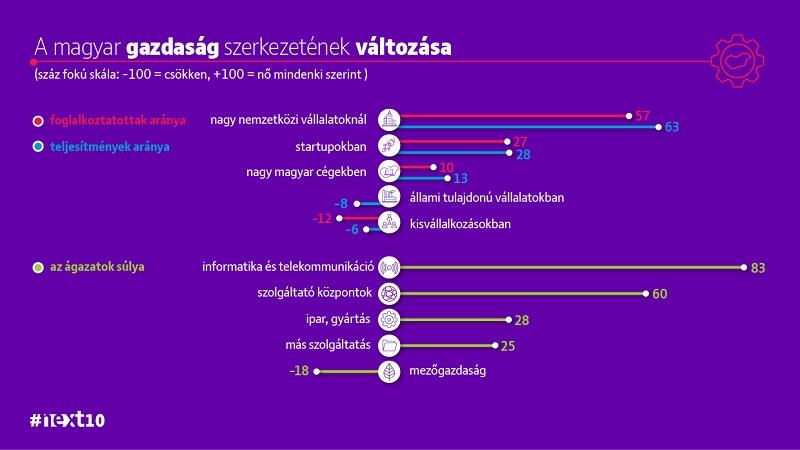 A többség várakozása szerint a következő tíz évben nőni fog a nagy nemzetközi vállalatok súlya a magyar gazdaságban. A kisvállalkozások és az állami cégek szerepvállalását összességében visszaszorulni várja a célcsoport. A gazdasági ágazatok tekintetében egyértelműen az informatika és a telekommunikáció dominál, és a többség a szolgáltatóközpontok térnyerését is valószínűsíti.