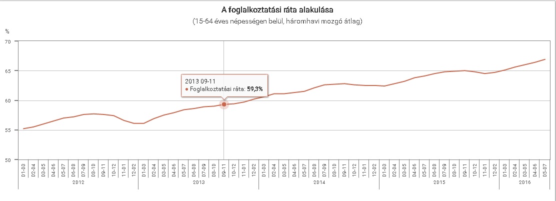Forrás: KSHA foglalkoztatottak közül 4 millió 332 ezren tartoztak a 15-64 évesek korcsoportjába, foglalkoztatási arányuk 2,7 százalékponttal 66,9 százalékra emelkedett.