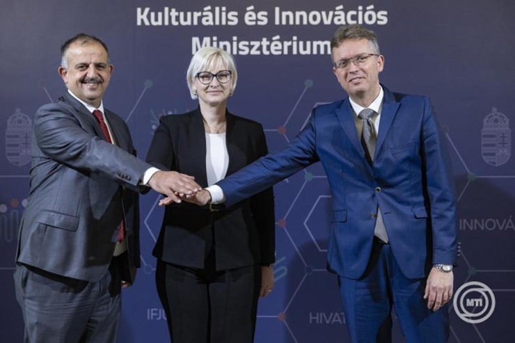 Charaf Hassan, a Budapesti Műszaki és Gazdaságtudományi Egyetem (BME) rektora, Erdélyi Margit, a Szegedi Szakképzési Centrum főigazgatója és Hankó Balázs kultúráért és innovációért felelős miniszter (b-j) a „három az egyben” képzés indulását bejelentő sajtótájékoztatón a Kulturális és Innovációs Minisztériumban 2026. február 9-én. MTI/Kocsis Zoltán