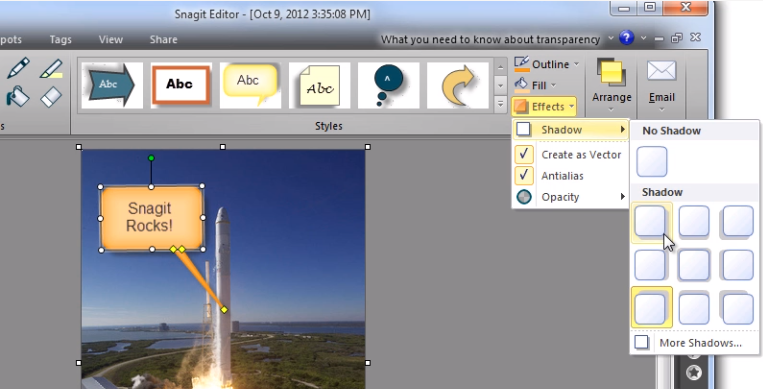 A Snagit telepítése után a PrintScreen billentyű lenyomása újabb funkcióval lesz elérhető: lehetőségünk lesz kivágni egy „célkereszt” segítségével a képernyőnek csupán egy részletét is. A kivágott tartalom egyből megjeleníthető a Snagit programban, ahol egyből módosíthatjuk szükség szerint a képet. Látványos objektumokat (pl. szövegdoboz, feliratok, nyilak) tehetünk rá, és látványos effektekkel gazdagíthatjuk a képet. Pl. keretet állíthatunk be. Ezekkel az egyszerűen használható funkciókkal könnyedén feldobhatunk egy tananyagot.