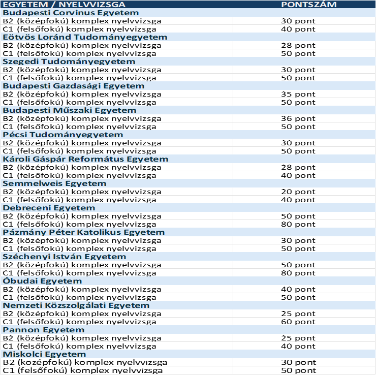 Az alábbi táblázat 15 népszerű egyetem esetében mutatja be, hogy mennyit ér egy komplex nyelvvizsga. (Fontos megjegyzés: Az egyes egyetemek és szakok pontszámítási szabályzata eltérő lehet, ezért mindig ellenőrizni kell az aktuális évi www.felvi.hu/ tájékoztatóját vagy az adott egyetem honlapját. Néhány egyetem már a részvizsgákért is ad pluszpontot.)