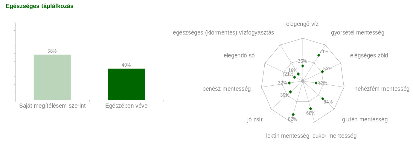 Az egészséges táplálkozást két mérőszámmal mérjük. Egyrészt mérjük azt, hogy hogyan ítéli meg saját táplálkozásának egészségességi szintjét a munkatárs; másrészt pedig összehasonlítjuk ezt egészében véve a kérdőív mögött álló integratív egészségmegőrzési tudással -.